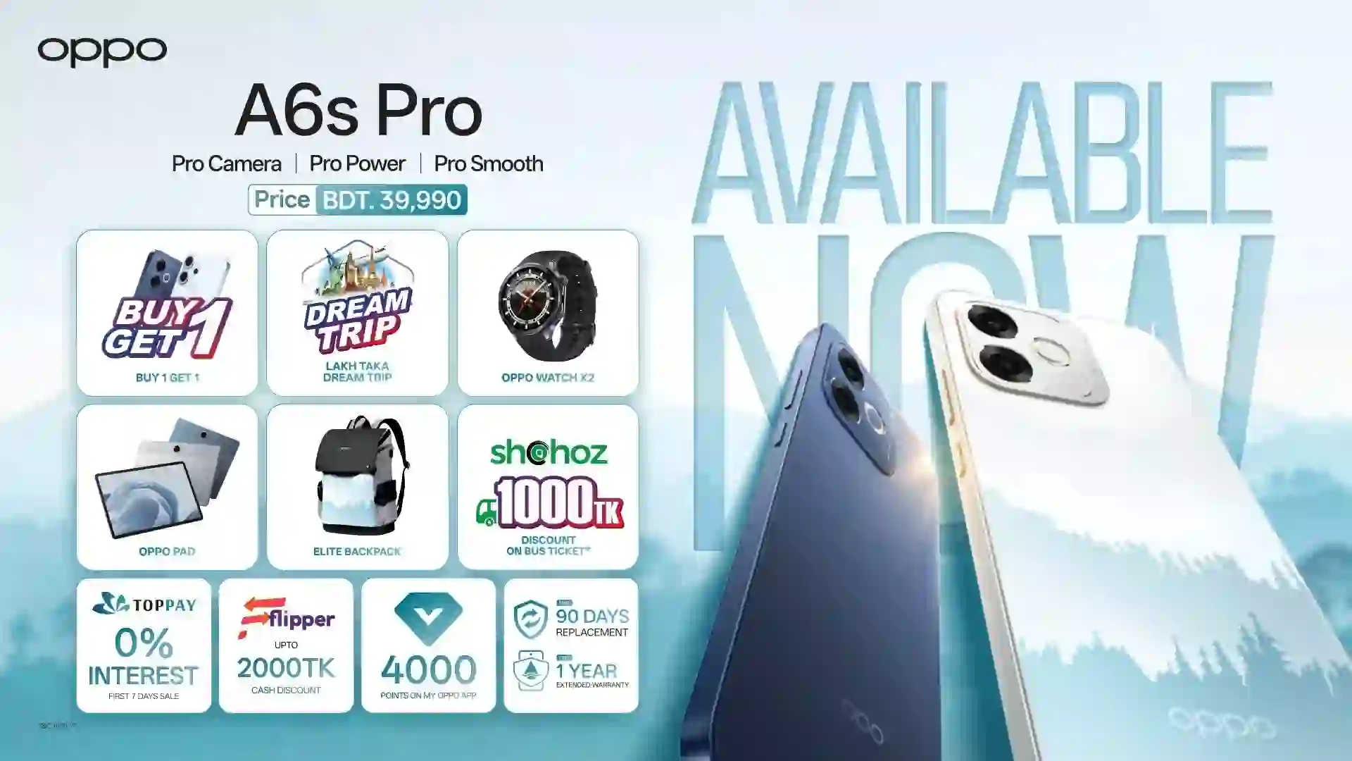 এই ঈদে কেনাকাটার অভিজ্ঞতাকে আরও আনন্দময় করতে অপো এ৬এস প্রো ক্রেতারা টপপের মাধ্যমে ০% সুদে কিস্তি সুবিধা, একটি এলিট ব্যাকপ্যাক ফ্রি গিফট, ৯০ দিনের ফ্রি রিপ্লেসমেন্ট ওয়ারেন্টি এবং এক বছরের ফ্রি এক্সটেন্ডেড ওয়ারেন্টি প্ল্যান উপভোগ করতে পারবেন। পাশাপাশি, ক্রেতারা ফ্লিপার থেকে সর্বোচ্চ ২,০০০ টাকা পর্যন্ত ক্যাশ ডিসকাউন্ট এবং মাই অপো অ্যাপের মাধ্যমে ৪,০০০ রিওয়ার্ড পয়েন্ট অর্জনের সুযোগ পাবেন।