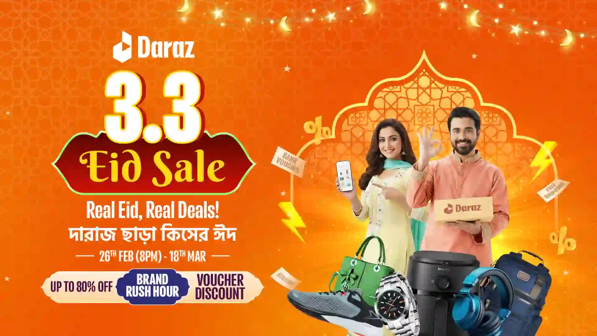 ঈদ উদযাপনের প্রস্তুতিকে আরও সহজ করতে এই ক্যাম্পেইনে থাকছে ফ্ল্যাশ সেল এবং মেগা ডিল যেখানে মিলবে ৮০% পর্যন্ত ছাড়, পাশাপাশি হট ডিলগুলোতে থাকছে ৭৫% পর্যন্ত বিশাল ডিসকাউন্ট। এছাড়া ক্রেতাদের জন্য রয়েছে ব্র্যান্ড ফ্ল্যাট ডিসকাউন্ট, সাইট-ব্যাপী ডেলিভারি ডিসকাউন্ট এবং নির্দিষ্ট পণ্যে ফ্রি ডেলিভারি সুবিধা। ফ্যাশন, নিত্যপ্রয়োজনীয় পণ্য, ইলেকট্রনিক্স, হোম অ্যাপ্লায়েন্স, হেলথ অ্যান্ড বিউটি এবং লাইফস্টাইলসহ প্রতিটি ক্যাটাগরিতেই দারাজ নিশ্চিত করছে বাজারসেরা দাম, যা রমজানের দৈনন্দিন চাহিদা মেটানোর পাশাপাশি ঈদের প্রস্তুতিকে করবে আরও সাশ্রয়ী।