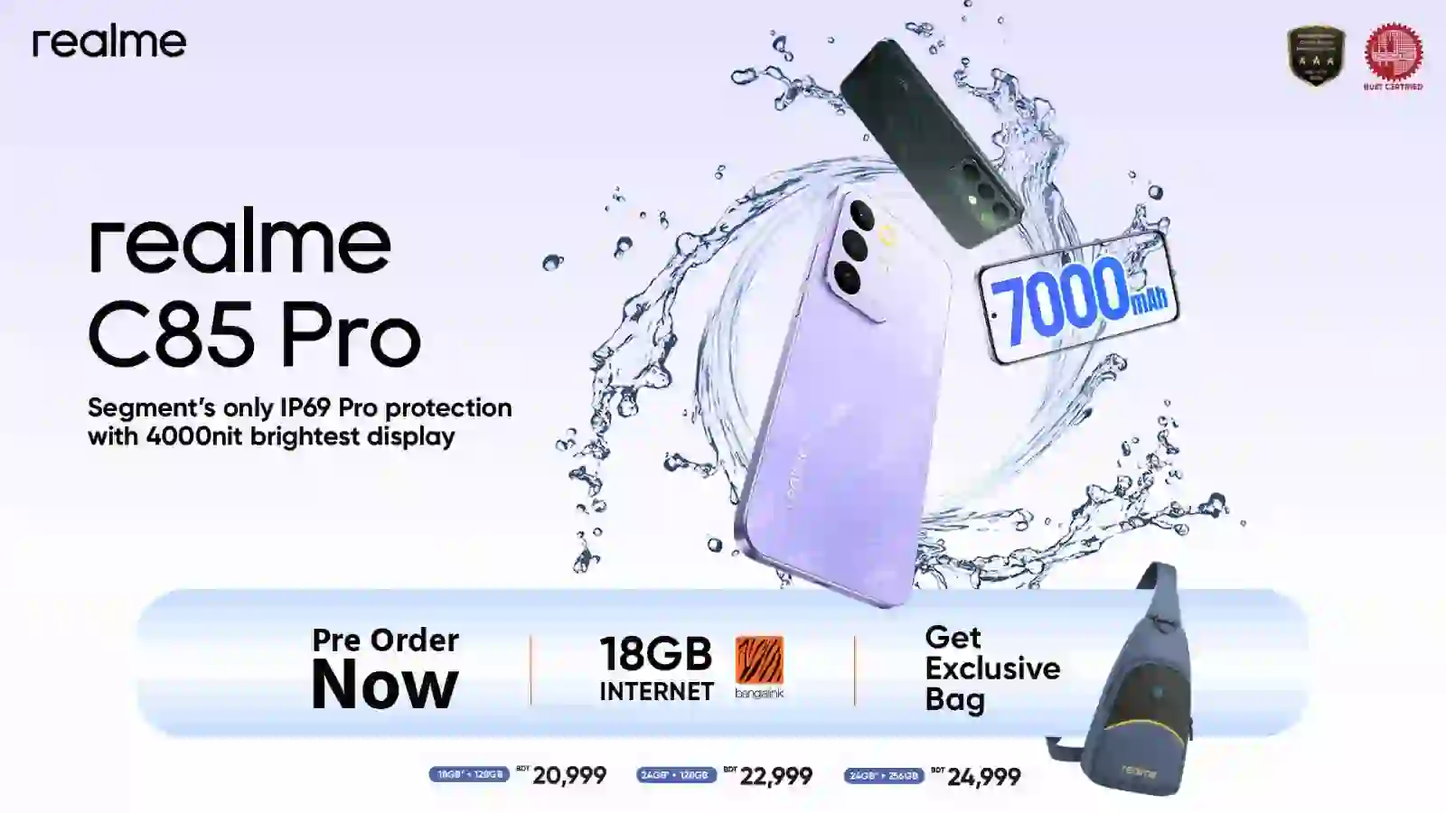 রিয়েলমি সি৮৫ প্রো-পানিতে টিকে থাকবে ৬০ দিন